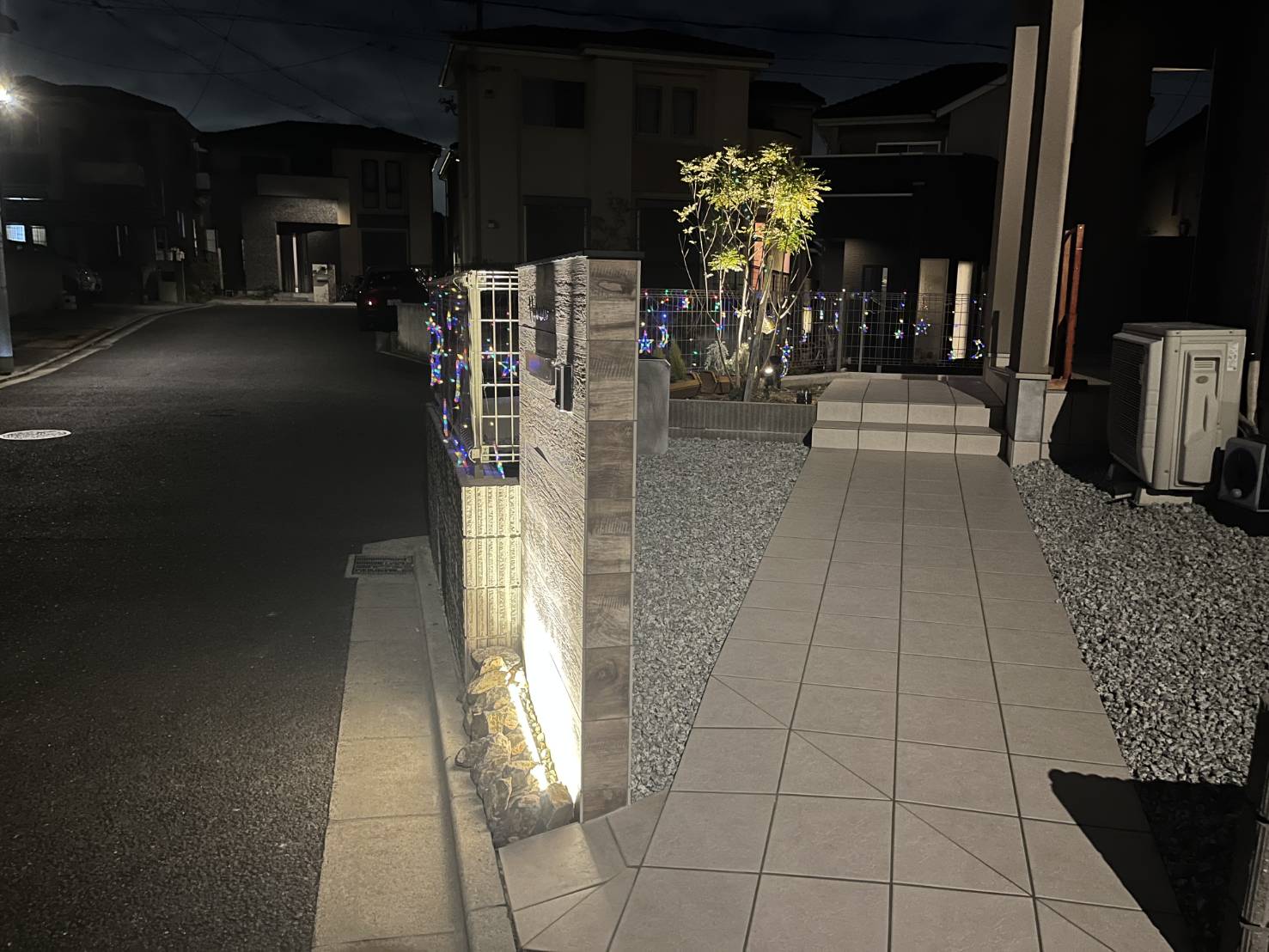 足元の石の内側に照明を隠し、夜は足元から照らします。