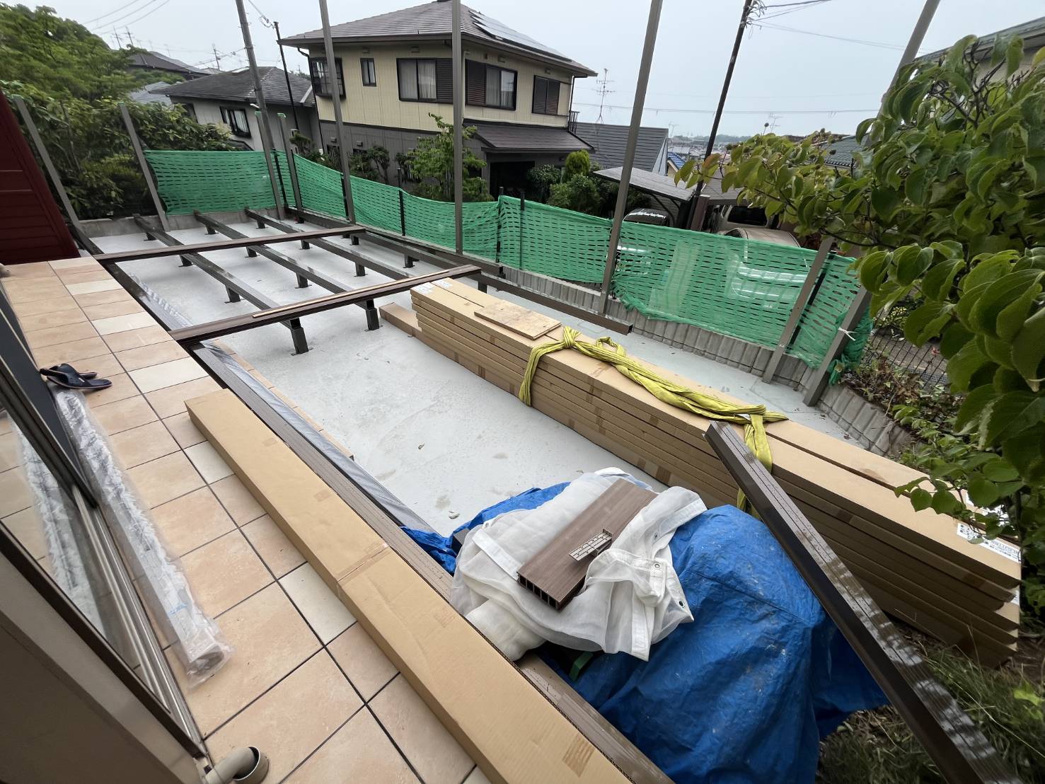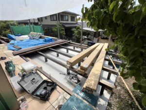 デッキ全体の強度と安定性を保つ土台となる、アルミの大引を設置します。
